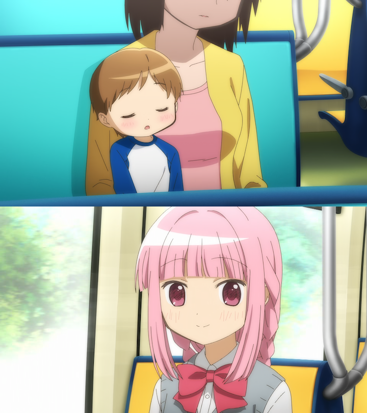 The way that the dialogue is written really resonates with me on a real emotional level. On first watch the audience isn't privy to the state of Rena's mental health so Kaede's comment about her “screwing around” comes across as harmless, at most a jab, later we will learn that Rena is deeply troubled by her relationships with her peers outside of her magical girl team. What I like about it too is that you can see glimpses of it in the background design. Not only do the holographic ads reflect the thoughts of the characters, they actually disappear and change every time the tone of the conversation shifts, punctuating the tension of this stupid argument, and almost making it feel like the world is actually being physically affected by the characters. This whole show has this dream-like quality, which is really cool and neat. Anyway, Momoko is such a nice lady, but she just does not know when to shut the hell up (I feel that). This is about the first time we see a distinct difference in the way she is characterized compared to the source material and, needless to say, I like this version of the character way more as she gives more of a single father vibe.