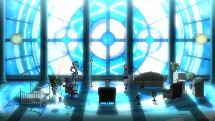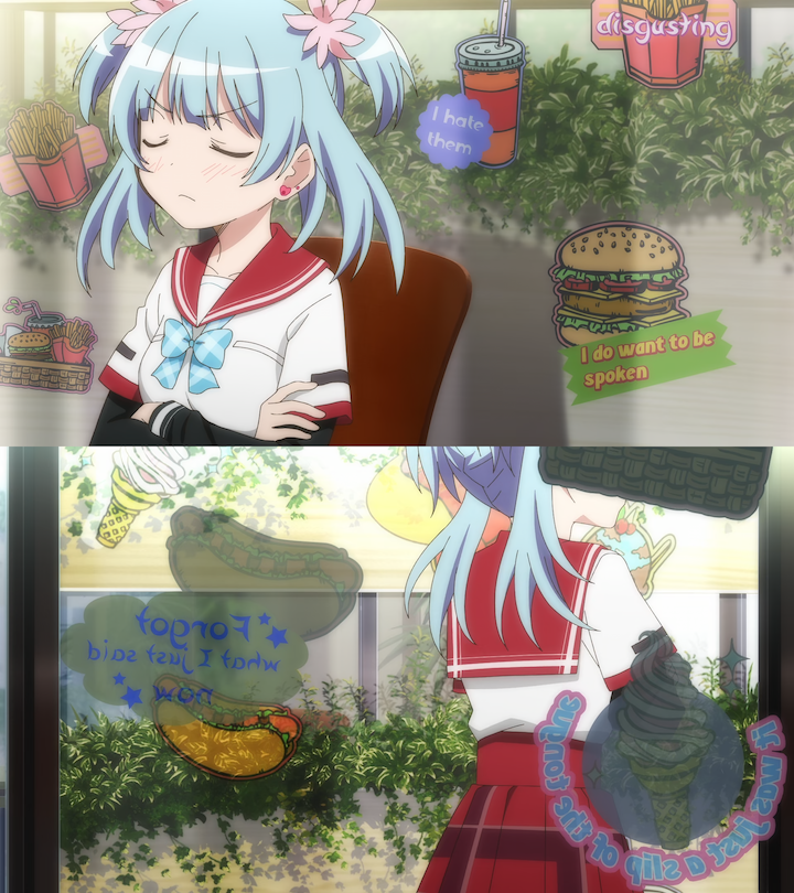 I typically hate all scenes with Kyubey (I honestly think he is such a stupid, worthless character), but this time it actually adds something to the story besides dumping exposition. Iroha talks to Kyubey about her unearthed memories while eating alone, sitting alone at school and ultimately being ignored by Kuroe. I like a lot of glimpses into Iroha's social life before Kamihama that are found in the game, but the anime adaptation is very tasteful with how concisely they portray Iroha being a social reject without having to resort to flashbacks or long inner monologues. It's very smart writing and directing and this portrayal also fits Iroha's personality to not be entirely aware of her loneliness or choosing to ignore it. It's amazing how much we can learn about who Iroha is as an individual with little to no dialogue, making her a great protagonist (though with that said, I do enjoy scenes that happen later in the series where characters talk openly about their feelings, they're neat).