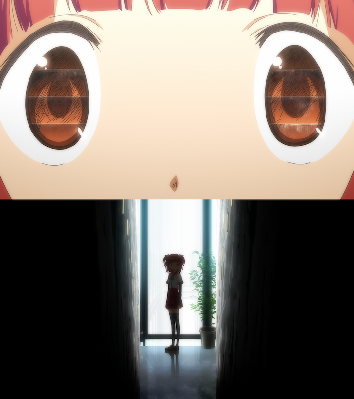 Iroha rises from the mass of bed sheets she was buried in. In my interpretation, this comes back later in the show as Iroha's tendency to freeze as a trauma response and withdraw from problems into a dream state. In this moment, however, we see her coming out of daydreaming and pretending that everything is fine by indulging in familial activities with her sister to make the decision to form a contract with that little white freak bitch. The show is packed with cool shots that don't hold your hand through each and every bit of visual storytelling. If I had to dig deeper, it is possible that this is also part of the desert theme. A lot of dream interpretation sources say that being buried in sand is symbolic for "feeling overwhelmed, a need for introspection, or a period of transformation". That feels very thematically consistent, but dream interpretations tend to differ from source to source and are mostly based on rational associations (rational associations being the source of most literary symbolisms duh).
